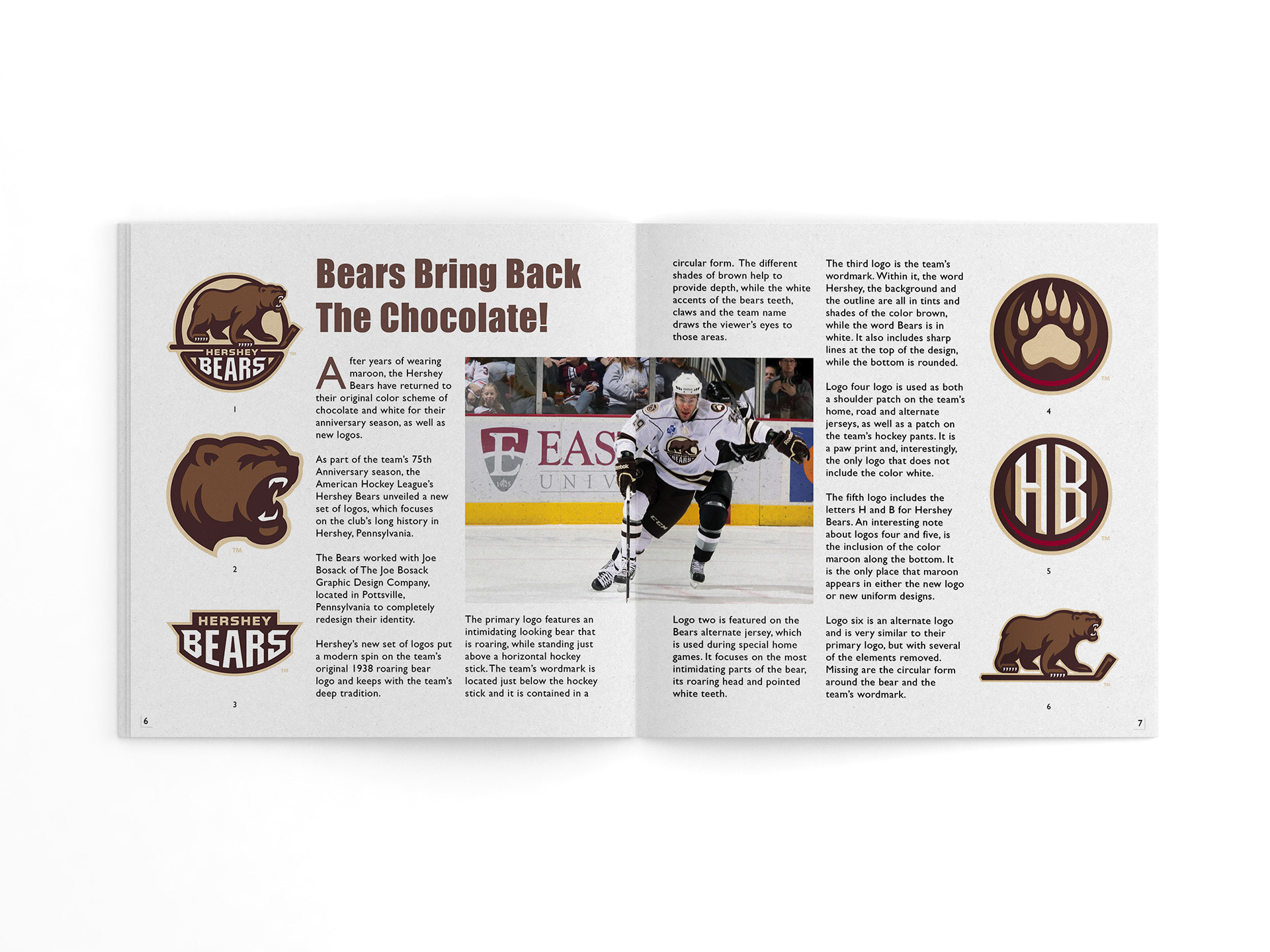 Logos On Ice includes more than 50 logos and pictures from American Hockey League franchises. In addition to showcasing logos, it also presents a case study of the Hershey Bears, as they celebrated their 75th anniversary season. The project was originally supposed to include logos from various leagues, but the deadline precluded this. I received permission from the American Hockey League to use their logos, with the stipulation that I would not profit from their use.